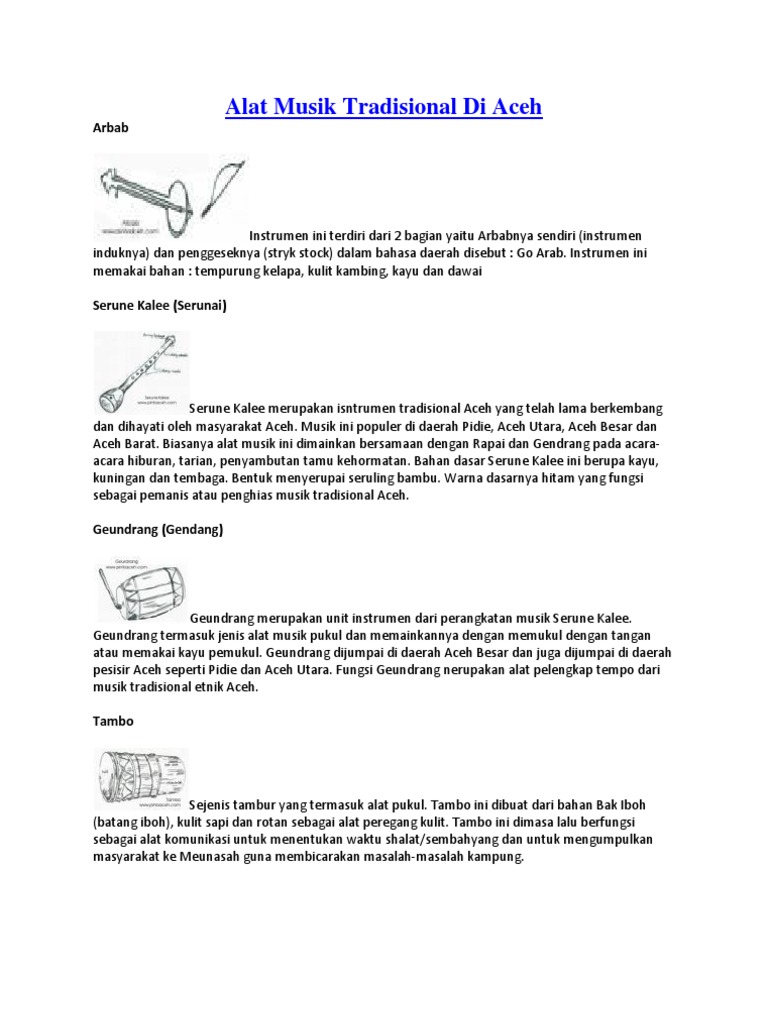 12 Alat Musik Tradisional from imgv2-2-f.scribdassets.com Sebagai catatan, serune kalee adalah alat musik tradisional aceh. Biasanya dimainkan untuk mengiringi berbagai acara. Suku to wana adalah yang memiliki alat musik khas ini. Alat musik tradisional saron adalah alat musik dalam instrumen gamelan yang berasal dari jawa tengan alat musik ini masih termasuk keluarga alat musik ini kegunaannya sebagai mengatur tempo irama bersama dengan serune kalee. Rapai merupakan salah satu alat musik tradisional khas aceh. Serune kalee merupakan alat musik tradisonal tiupyang berasal dari aceh. Cara menggunakan serune kale adalah dengan ditiup dan menggunakan jari untuk mengatur nada yang ada di lubang serune kale. Sarune kale berasal dari nanggroe aceh darussalam yang mempunyai jenis bunyi aerofon yaitu bunyi yang berasal dari.