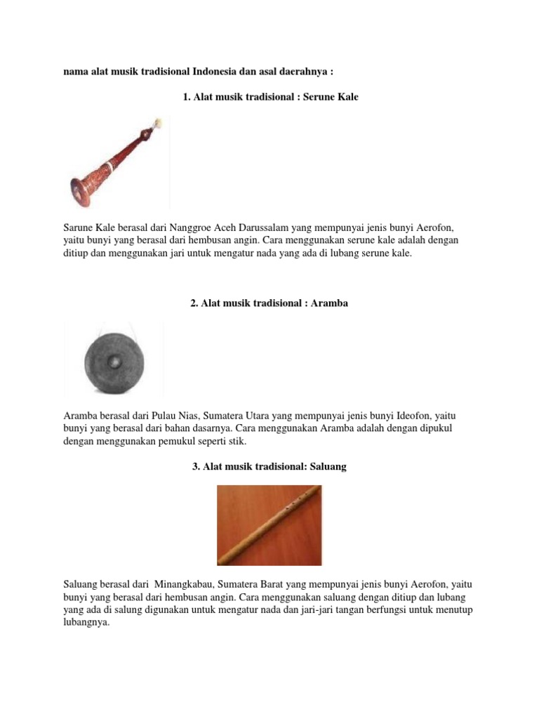 Serune kalee merupakan alat musik tradisional yang berupa terompet khas aceh dengan dengan struktur bentuk mirip klarinet. Suara serune kalee terdengar seperti bansuri. Alat musik ini dimainkan dengan cara dipukul atau bisa juga ditabuh menggunakan tangan kosong, tidak menggunakan alat bantu stik dan serune kalee digunakan sebagai instrumen yang utama pada suatu pertunjukkan musik di aceh. Alat ini digunakan sebagai instrumen utama dalam sebuah pementasan musuk. Adapun alat musik juga memiliki fungsi yang dapat di golongkan menjadi 3 fungsi utama, diantaranya adalah fungsi melodi, fungsi retmis, dan fungsi harmonis. Suku aceh memiliki beragam alat musik tradisional, hanya saja yang menjadi ikon budayanya adalah alat musik yang bernama serune kalee. Alat ini sangat polpuler didalam masyarakat melayu khususnya aceh. Serune kale mengeluarkan suara dengan jenis aerofon. Tong (suara rendah), ting (suara tinggi) serta tang (suara umum). Fungsi dari alat musik ini adalah sebagai pengatur tempo dari musik dan alunan nada pada sebuah pertunjukan orkestra serunee kalee. Aramba adalah sejenis gong kecil yang sering dimainkan dalam upacara adat batak. Alat musik serune kalee adalah alat musik tradisional yang bentuknya ini hampir sama dengan bentuk klarinet atau bentuk terompet. Kolintang adalah alat musik tradisional asli daerah minahasa sulawesi utara.