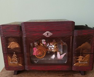 Toyo music box jewelry box 3d japon evi scenery red baize lining w/ mirror.